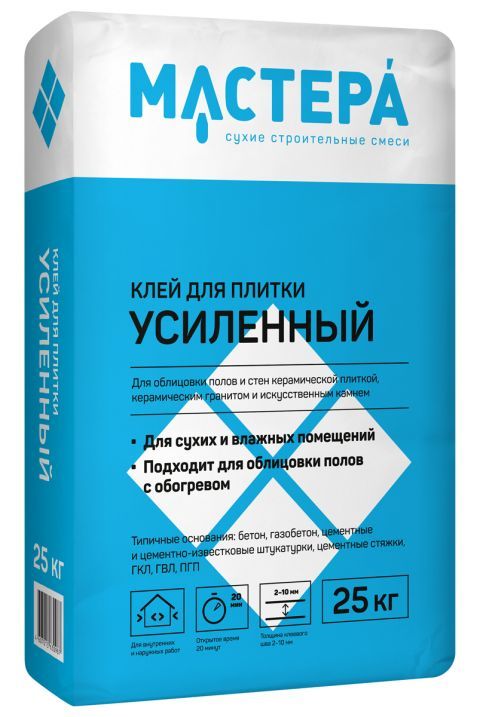 Для облицовки оснований полов и стен керамической плиткой, керамическим гранитом и искусственным камнем размером до 60х60 см. Применяется на основаниях из бетона, железобетона, ячеистом бетоне и пазогребневых плитах, гипсокартонных и гипсоволокнистых листах, цементных и цементно-известковых штукатурках, цементных стяжках. Для внутренних и наружных работ. Для сухих и влажных помещений. Подходит для полов с обогревом. При пониженных температурах использовать клей для плитки «УСИЛЕННЫЙ» ЗИМНИЙ.